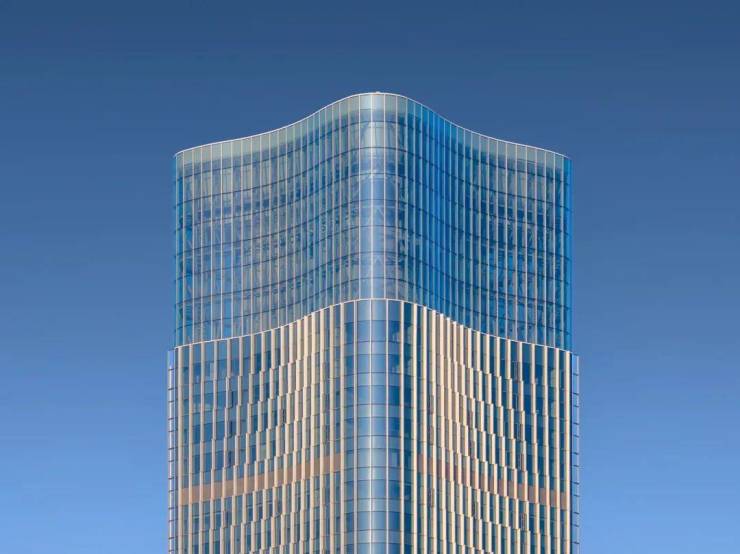 大厦造型简约大气,利用泉水、山峰、阶地作为设计理念和寓意,塔冠泉水寓意欣欣向荣,蓬勃发展,塔身山峰寓意财富积聚,基业稳固,裙房阶地寓意层层递进,生生不息,再创辉煌。