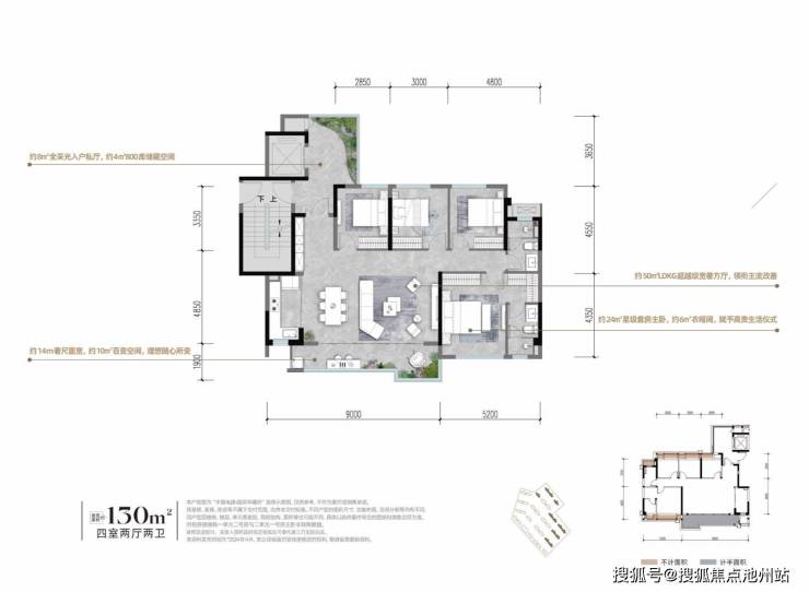 户型亮点:约8㎡全采光入户私厅,约4㎡800库储藏空间;约50㎡LDKG超越级宽奢方厅,领衔主流改善;约24㎡星级套房主卧,约6㎡衣帽间,赋予高贵生活仪式;约14m奢尺面宽,约10㎡百变空间,理想随心所变
