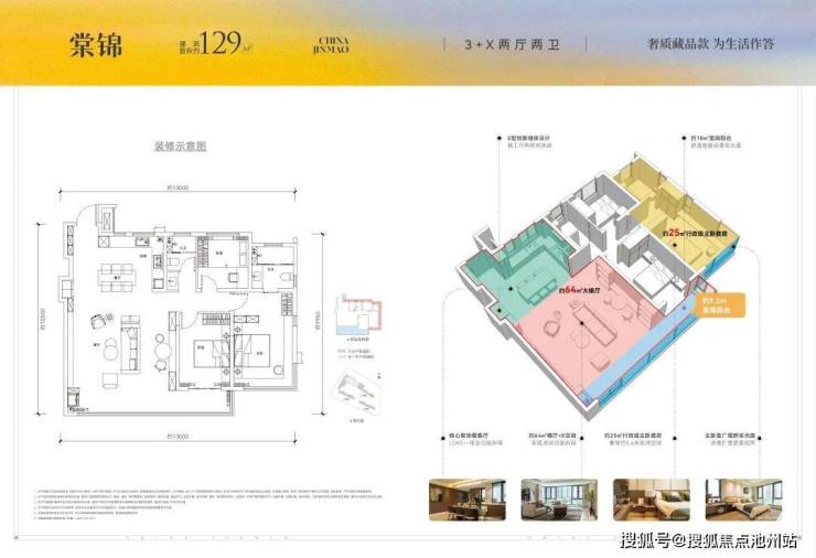 129平户型,S型创新墙体设计,更多收纳空间;约18平大阳台;约25平主卧套房,约64平大横厅,空间可变性强。