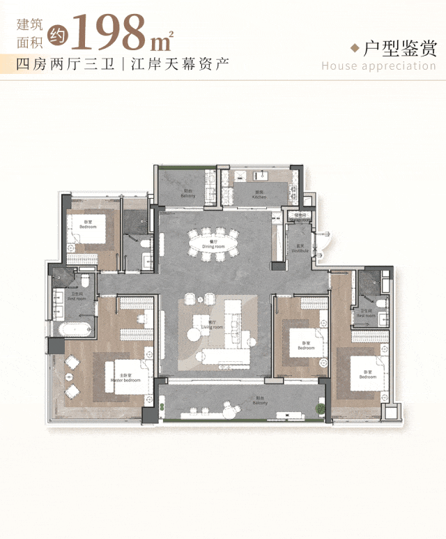 建面约198㎡户型,四开间朝南,南向面宽达到超17米,与市面同面积段户型,狠狠拉开距离。