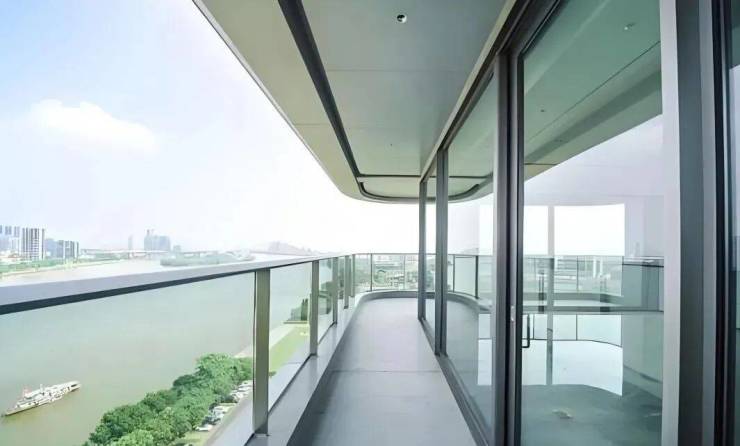 更震撼的体验,是当你步入阳台时。弧形玻璃的设计,让江景全画幅被你的视觉所占有,带来极强的视觉冲击力。驻足于此,你不需要去眺望江景,而是开阔的珠江直接将你环抱。