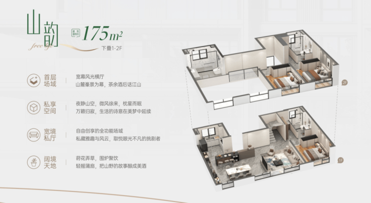 相对于纯粹的叠墅,翔龙天汇做出的是上叠+平层+下叠的组合,还是市区较为稀缺的山景叠墅,主打高赠送、低密度。