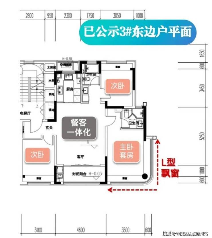东边户为三房两厅两卫,为园区为数不多的三分房设计,总面宽约11.2m。LDKB一体化设计,阳台4.6m,主卧开间约3.5m,其余卧室开间均在3.05~3.1m左右,整体空间感不错。