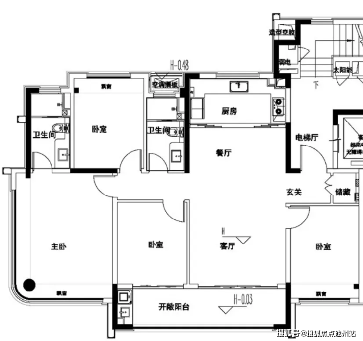 此户型为四开间朝南,客厅为方厅,开间4.2m,DBK一体化动区设计;开放阳台,开间7.2m;主卧套房设计,配备独立卫生间,三个卧室拥有飘窗。