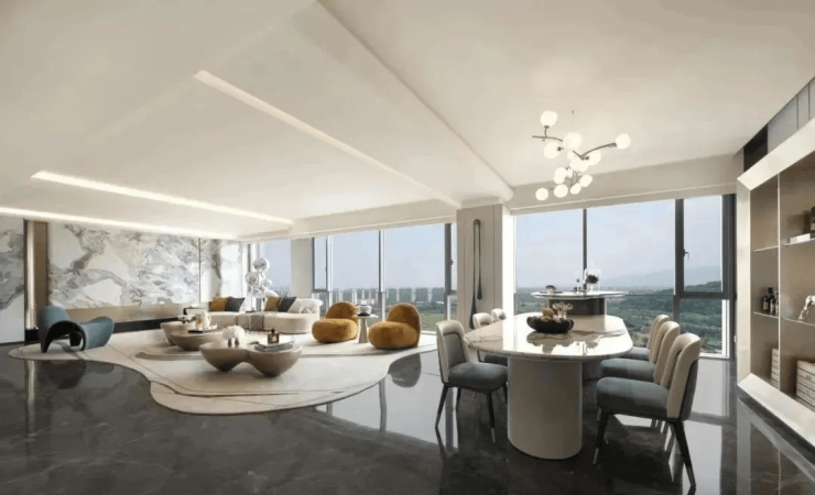 空间设计:300-320㎡精装大平层实现零公摊,4.3米层高打造空中墅居体验,270°环幕采光面搭配24米南向面宽,LDK一体化社交厅达65㎡