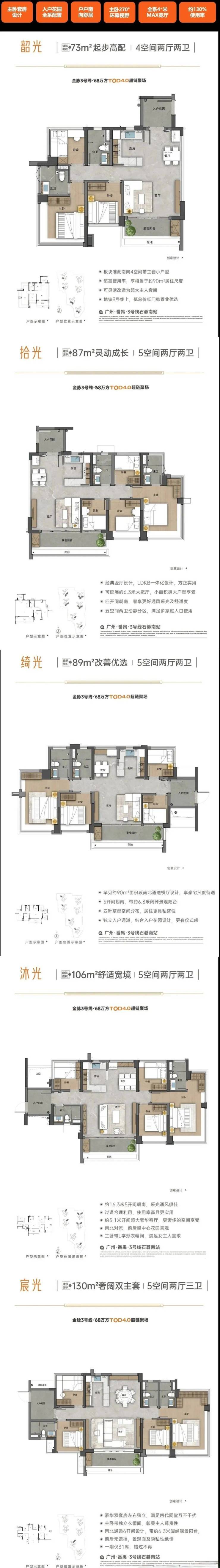 主力户型为建面73m²、87-89m²、109m²、130㎡的四到五房,刚需刚改都能上车
