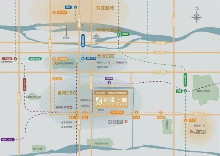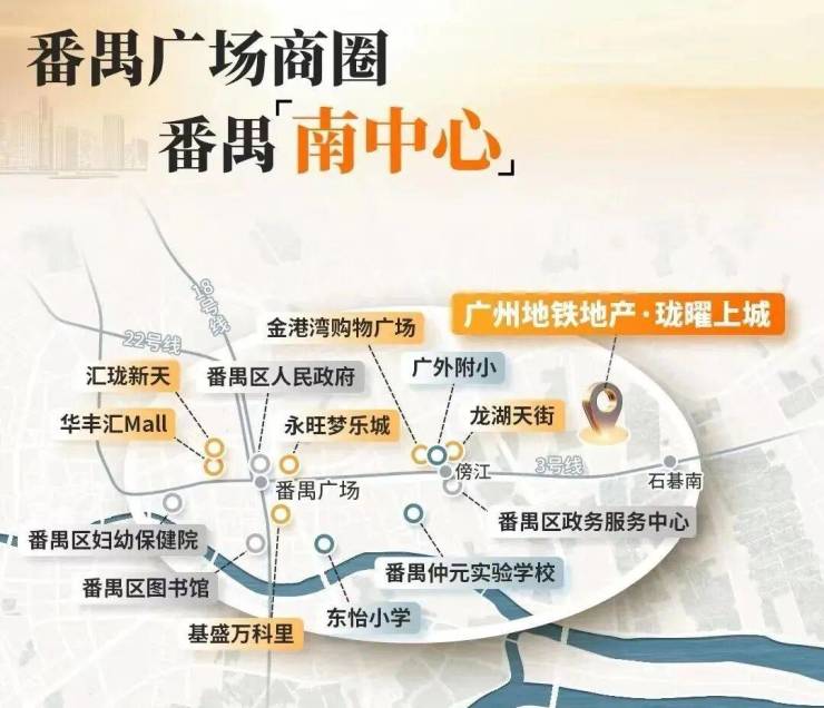 依托3号线半小时共享广州黄金三角CBD+万博CBD+南沙CBD商圈配套;商圈金脉之上,串联万亿CBD及繁华都市商圈。
