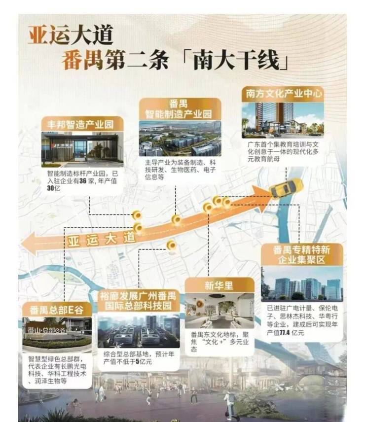 值得注意的是,以番禺广场商圈为起点,连通到莲花湾汽车产业带,“第二条南大干线”千亿产业轴已在酝酿。亚运大道沿线,密布番禺总部E谷、智能制造产业园、丰邦智造产业园等节点,这里将是番禺的“智核”所在,也是番禺未来所在。