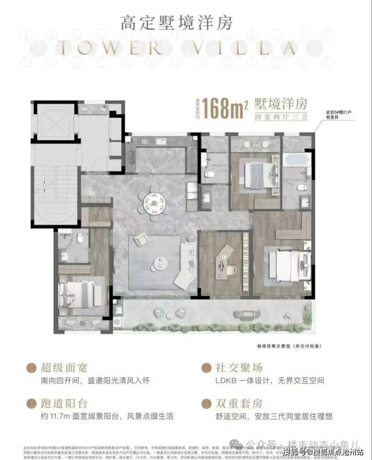 4房3卫布局,满足成长改善家庭需求;约14.9米南向大面宽,四开间朝南,LDKB一体化布局及双拐角270°采光阳台,最大化延伸空间感;南向双套房,以高实用性媲美市面上200㎡+产品;约11.7米三连大阳台更是点睛之笔,据说精装标准也是板块内的天花板。全屋智慧中枢摩根智能系统】从单元门人脸识别到七合一智能门锁,摩根智能系统串联大金中央空调、汉纳地暖、兰舍新风系统,搭配场景化灯光控制,智能窗帘控制。东吴序以科技为基础,实现零接待同行,让归家动线成为流畅的归家仪式。【全屋一线国际品牌奢装】SMEG油烟机、三眼燃气灶、蒸烤一体、13件套洗碗套件,打造意大利顶级家电品牌;杜拉维特浴缸、马桶与高仪五金,让卫浴空间成为美学展场;定制美妆冰箱镜柜,则于细节处实现功能与艺术的兼顾。