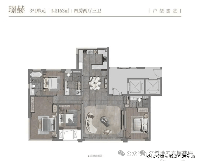 建面约153平的四房两厅三卫,三开间朝南,属于四叶草结构,卧室之间互不干扰,但动静分区弱,主卧紧邻客厅。该户型的南向次卧卫生间是暗房,南向次卧外有空调机位,采光可能会有一定的遮挡。