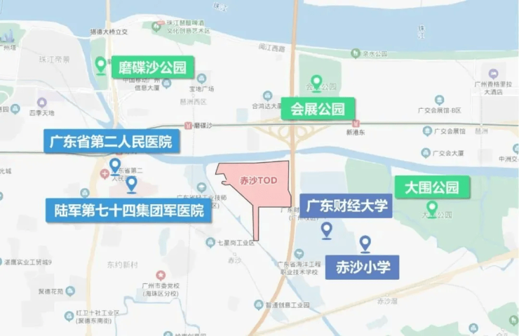 琶洲南 TOD 周边交通十分便利,地铁环绕。目前距离 8 号线 / 18 号线磨碟沙站约 700 米,12 号线赤沙站位于地块中部,11 号线石榴岗站约 1.2 公里。