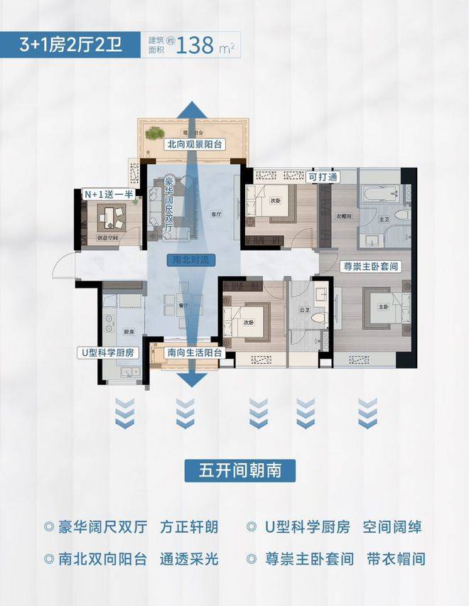 南北对流大平层 | 建面约138㎡四房两卫:这款户型拥有南北双阳台,五开间朝南,高赠送面积,超大主卧套房,百变空间设计灵活多样,满足不同家庭需求。