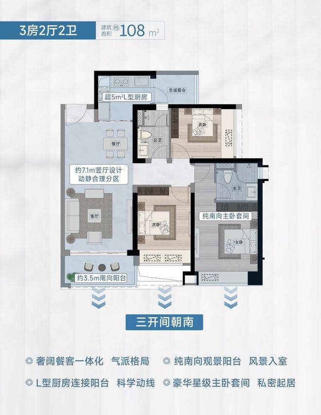 品质三房 | 建面约108㎡三房两卫:该户型采用奢阔餐客双厅设计,纯南向双阳台,L型厨房布局合理,豪华主卧套间尽显尊贵气质。