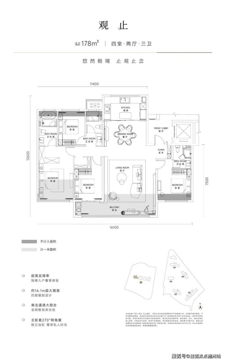 建面约178平四室两厅三卫:此户型位于A1号楼,四开间朝南,南向开间16米,整体比较方正,南向有两个套房,大平层尺度不错,主卧以及双联阳台均有一定优化面积,据说优化后得房率能做到94%。不过该户型总价要500多万,上车门槛不低。