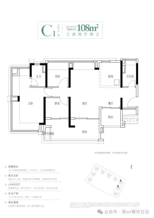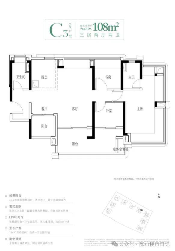 建面108平四房,该户型有三个面积段,都做到了南北对流设计,主要分布于1、2、4栋,1栋的108平会被前面的95方挡住一点视野