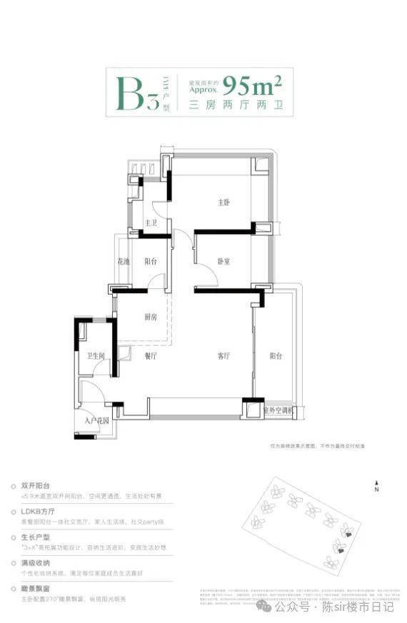 建面95平三房,该户型有四个不同的户型,都是竖厅和横厅设计,还有南北对流的户型,主要分布于2、3栋,靠近里面没有什么噪音影响。