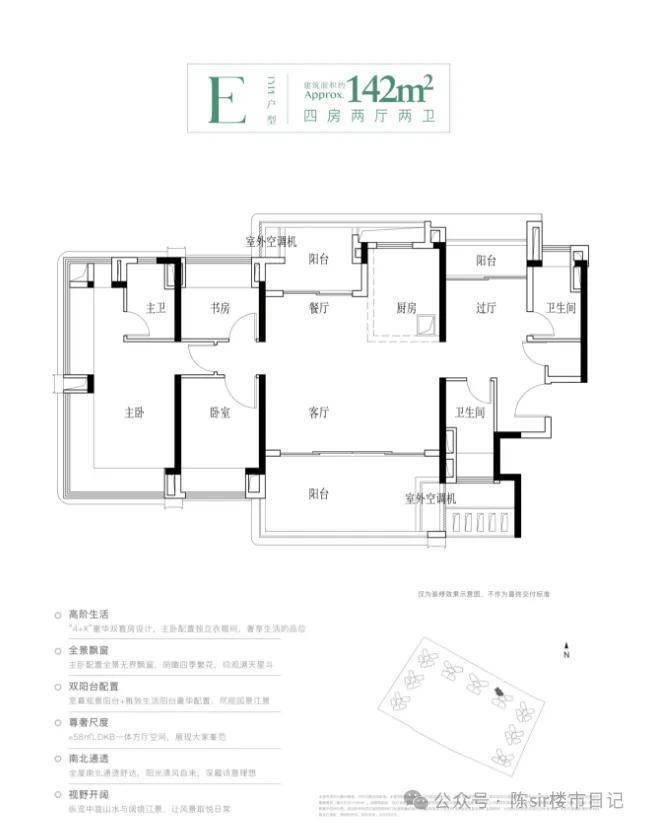建面142平四房,同样是分布在4栋,南北对流双阳台设计,LDKB一体化大方厅,主卧还配建了独立衣帽间,使用面积完全不输160平以上的户型。