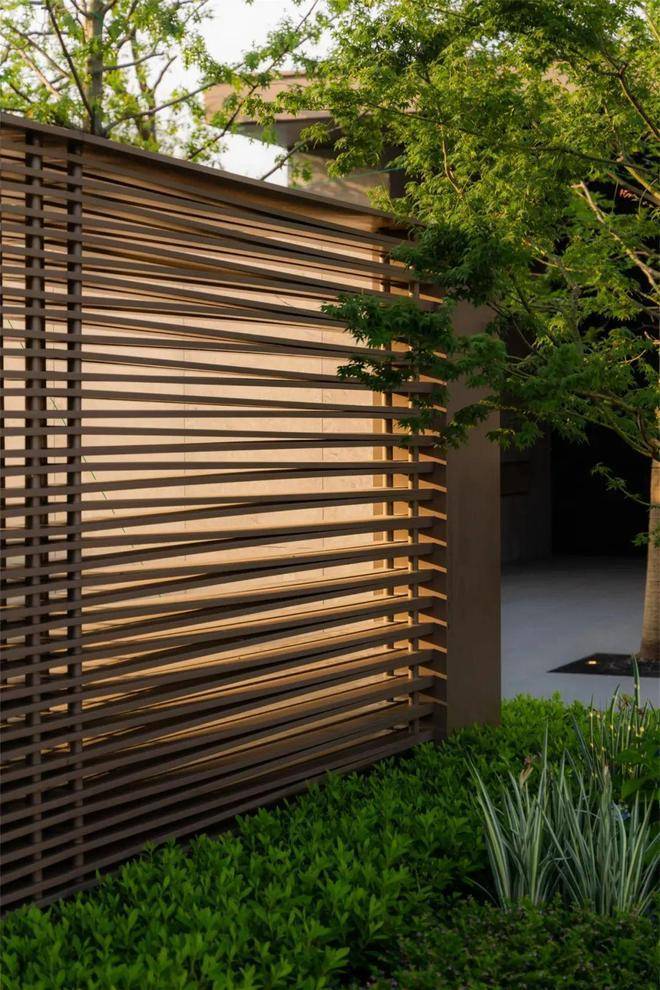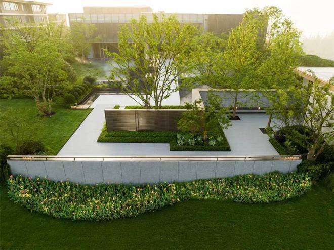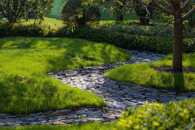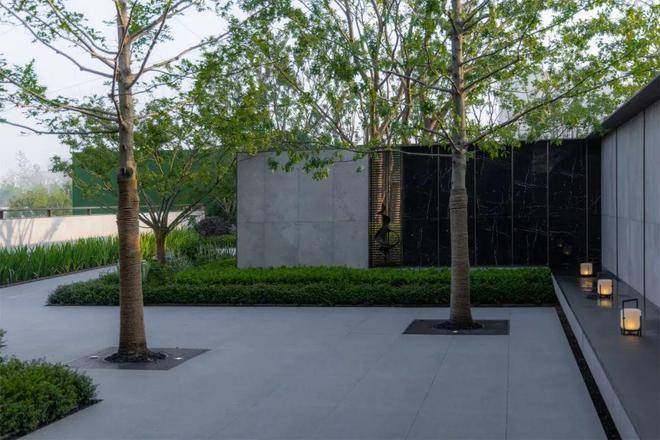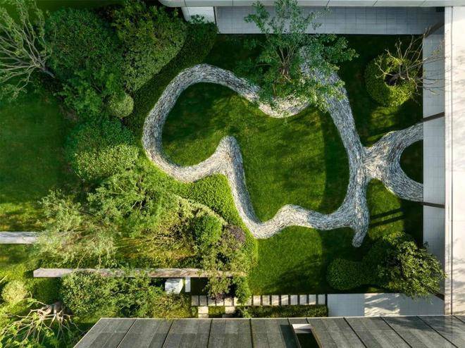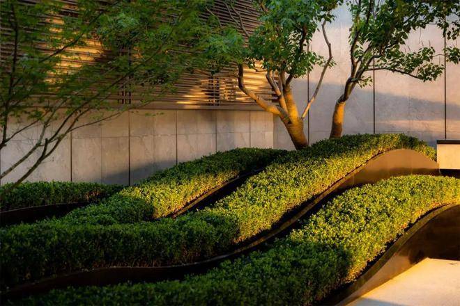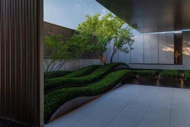 空间的转换是情绪的铺陈,收放之间,尽显品质。步入后场,空间再次被打开。波浪形绿篱仿佛有韵律地流动着。材质与线型的使用延续前场的风格,创造出富有品质感的宜居环境。草木之间,条石组成蜿蜒曲折的溪流,营造出自然的韵律感,构成富有趣味性的景观小品。