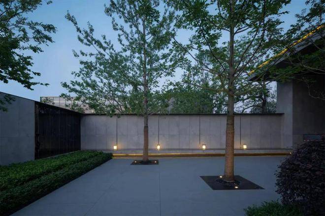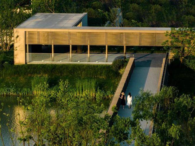 经过廊桥,示范区入口映入眼帘,接待车在此停泊、落客。眼前的树木阵列排布,强调出仪式感。踱步经过入口连廊后,空间收紧,草木围拢之中,静谧氛围如入秘境。