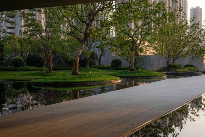 At the place where the winding path leads to the quiet, the space is open and clear. Mirror pond, stacked water, spring, green island ...... natural aura comes to you, standing in the axis walkway, both sides of the flowing tree pond floating in the water, layers of pool edge to create a drop ripple mood, making people seem to be placed in the dense valley. The residents' spiritual needs of being close to water and water can be satisfied here.