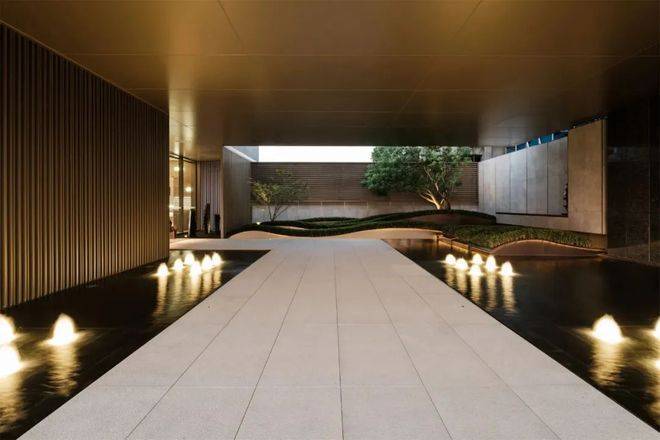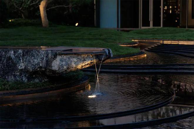 The reflection is quiet and warm, revealing a sense of quality in its simplicity. The cascading steps give a dynamic rhythm to the mirror water, and the array of starlight and gushing water highlights the sense of ritual, complementing the naturalness of the surrounding curves.