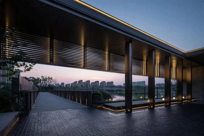 移步入桥,静享水畔美景。漫步于廊桥之上,远处河水潺潺,清波荡漾,宁谧气氛舒展开来,心灵也得以享受沉静。水色与天光相融,映出了岸居的独特体验。眼下,香槟金色的廊桥在自然景致之中熠熠生辉,尊贵气质在此彰显。金属感与石材紧密贴合,充分展现了现代极简之美。自然与人工此刻巧妙结合,都市园林的独特气质也得以淋漓展现。