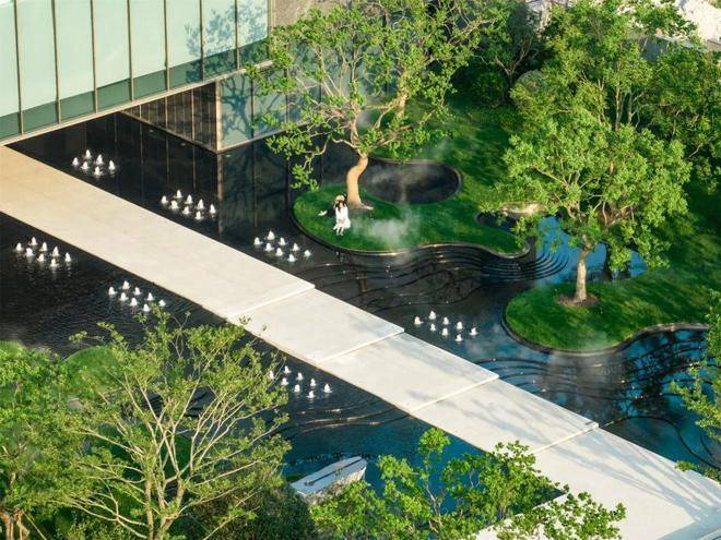 The tranquil mirror pond and the bubbling spring reflect each other, enriching the vision between movement and stillness. The organic combination of water, stone and green makes the concept of "Smoky River Forest" exquisitely presented here. In the midst of leisure and pleasure, people are removed from the noise of the city and immersed in the slow and quiet time.