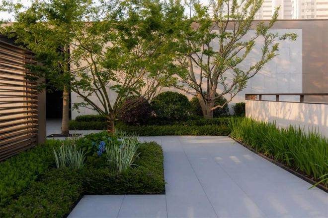 The transformation of space is the laying out of emotions, and the quality is revealed between the collection and the release. Stepping into the backyard, the space is opened again. The wave-shaped hedge seems to flow rhythmically. The use of materials and lines continues the style of the front field, creating a livable environment with a sense of quality. Between the grass and trees, the stones form a winding stream, creating a sense of natural rhythm and forming an interesting landscape vignette.