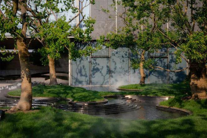 曲径通幽处,空间豁然开朗。镜池、叠水、涌泉、绿岛……自然灵气扑面而来,立于轴线步道,两侧流动的树池浮于水中,层级池边营造跌级涟漪意境,使人仿佛置于氤氲山谷。居者亲水、近水的精神需求在此得以满足。