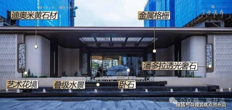 在选材上,不惜工本,投入巨大。安哥拉黑、福鼎黑、迪奥米黄石材等一一安排,绿植特选罗汉松、朴树等,再搭配叠级水景、艺术花境等,营造出伴水归家的礼序。