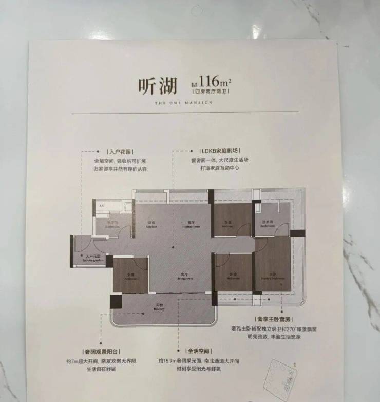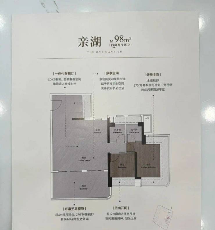 看户型图,每个阳台开间都非常大,270度的视野,最小的98方都能做到6米阳台,能将景观优势最大化。