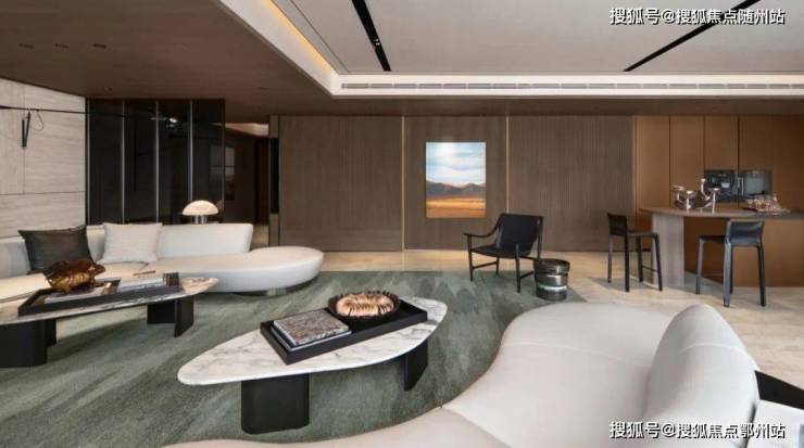 渡边智昭的约520m²设计作品,设计主题是「艺术桃花源」:一开门,映入你眼帘的是纯手工打磨的哑光亚克力玻璃,地面通铺的是「直纹白金沙」的平行四边形拼花,窗外是杭州大厦与连绵的西湖群山。 沙发背后一道可开可合的弧形移门,创造出一个别样温馨的小尺度空间。岛台、餐厅、客厅和壁炉咖啡厅……功能足够多,才能形成空间的流动性。