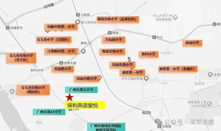 工业大道中小学、广州市第41中学、广州市第5中学、广州昌岗中路小学(翠城校区)、广州市海珠外国语实验中学附属学校、红棉小学(顺意小区)、海富小学、南燕小学、宝玉直小学(南边路校区)