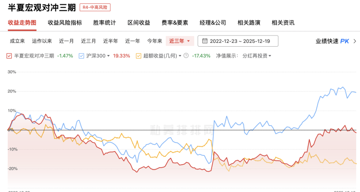 另一只有公开业绩展示的基金半夏宏观对冲三期,截止12月19日,近三年收益率为-1.47%,同期沪深300收益率19.33%,跑输大盘20个百分点。