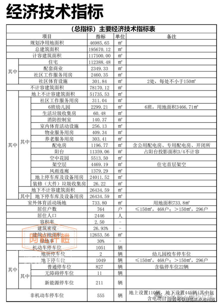 项目规划净用地面积约4.7万方,总建筑面积约19.57万方,计容建筑面积约11.75万方,住宅建筑面积约11.24万方,容积率2.5,居住户数764户,机动车停车位1051辆,车位配比1∶1.38,户均建筑面积约147.1平。户型建面大于150平的为296户,小于150平的为468户。