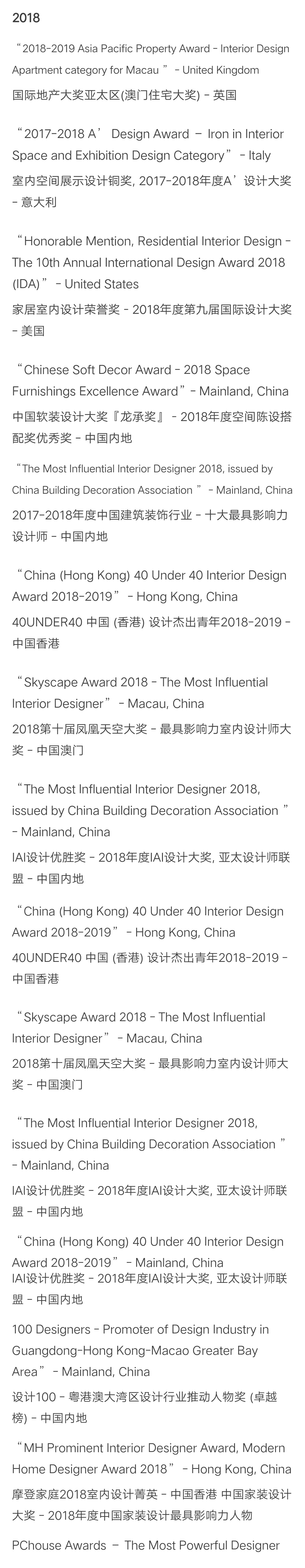 近期更回到香港开设公司,版图扩及香港、澳门及内地,累积超过五百项设计工程,荣获众多奖项之余也加入不同的协会与其他设计人士相互交流切磋,Eric早已得到各界人士的认可。
