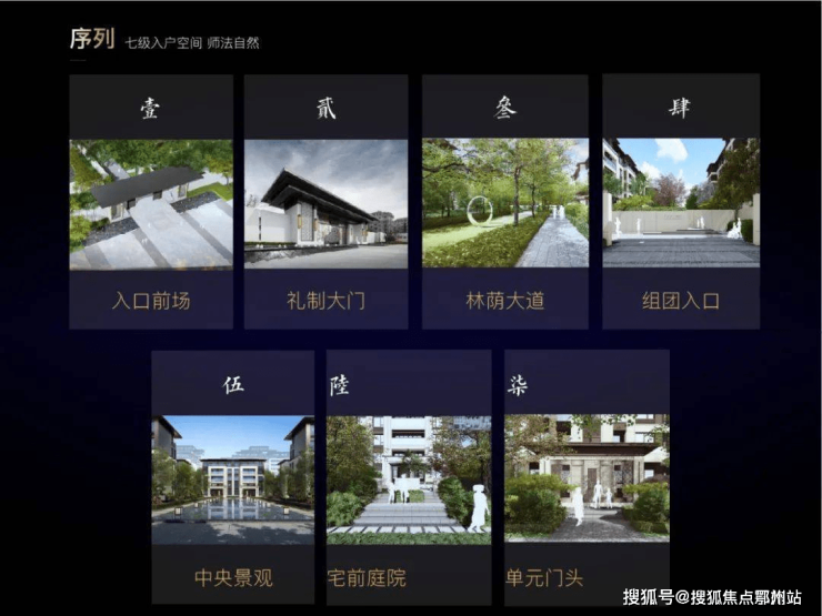 于林荫大道配置更有仪式感的归家廊道;于组团入口处配置流光四院;于中央景观轴内配置休憩庭院;于宅前庭院内配置挑空大堂;