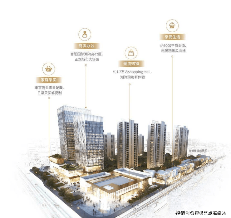 观影等精致生活需求;回到社区,全龄段的场景设置可让一家人都找到适合自己的休闲方式。在建筑的考量上,顺应城市文化肌理,取富阳山水之魂于立面