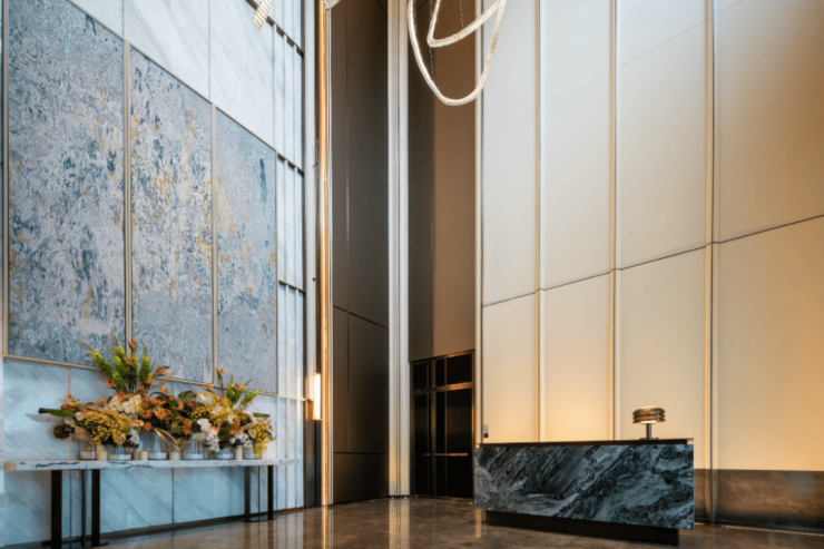 在这里,你既能看到远超业内常规尺度的约13米挑高,也能看到来自于杭州金色竹林意象的木色基调“暖装修”。其与建筑外立面形成呼应,充满盎然向上的生命力和温润质感,点缀以“玉琮青”大理石,既显矜贵又不失人文关怀。在这里,大堂将真正成为回家的过渡,成为生活的一部分。