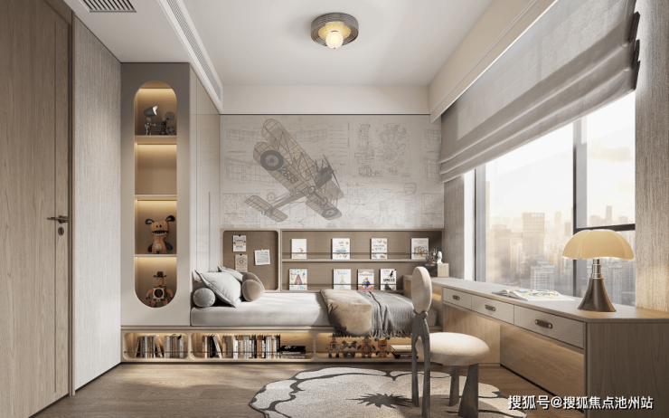 儿童房:以成长叙事与趣味探索为设计内核,将温暖的木质色调与柔和的灰白基底编织成安全包容的背景幕布。中央的舒适睡床与多功能书桌形成L型布局,嵌入式储物书架沿墙面延伸,既满足了学习收纳需求,又通过亮色点缀的玩具和书籍勾勒出童真轨迹。