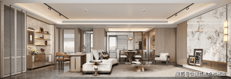 客厅:开放式的空间是全家的核心共享空间,巧妙融合了客厅、书房、餐厅与厨房区域,营造出通透而流畅的空间体验。温暖雅致的米色与木质棕构成主色调,与白色大理石纹理墙面相得益彰,既满足了现代生活方式,又通过精美的材质碰撞增添美学层次感。