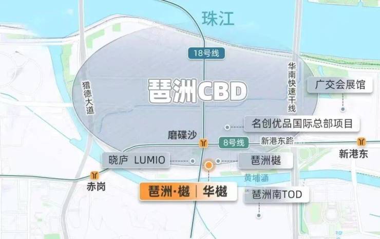 项目交通优势明显,最近的地铁站是位于琶洲西区核心位置的磨碟沙地铁站,8/18 号线在此双线交汇,与项目仅隔着一条新港东路,直线距离约 200 米。