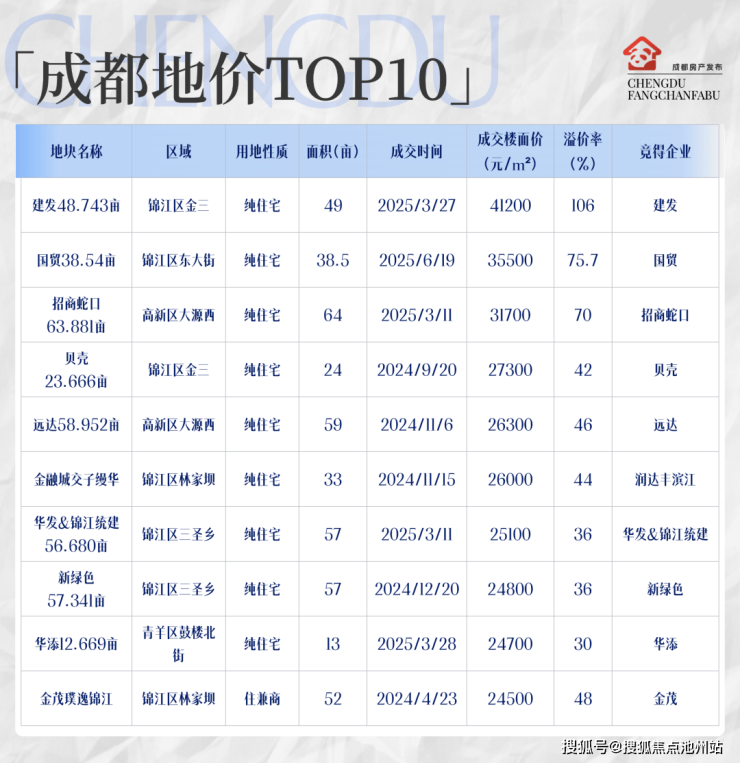 随着今日锦江区茶厂38亩地块成功拍出,成都土地市场成交楼面价前十的地块名单俨然是高端市场格局的缩影。