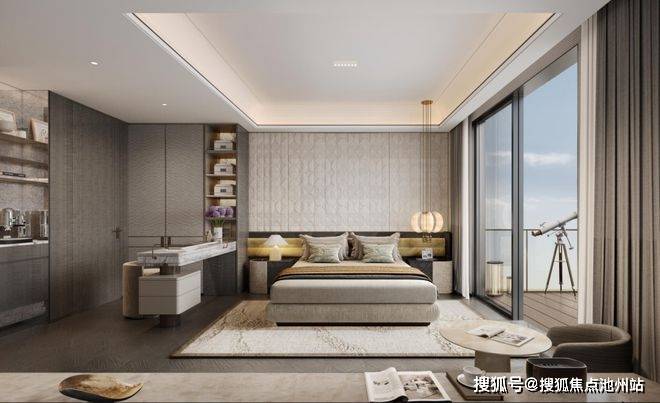 从效果图上看,主卧空间也很大。进深不仅能放得下双床头柜,还能做个梳妆台或者是水吧台。