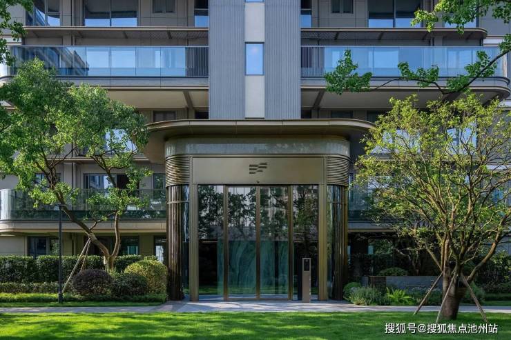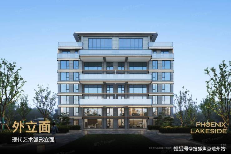 立面设计上,项目采用曲线艺术风格,打造超流体立面。材质上运用铝板、金属线条和落地玻璃窗。色彩搭配上,通过香槟金搭配月影白,赋予建筑独特韵味。