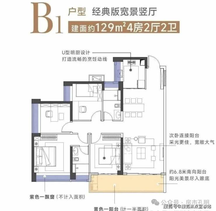 建面129㎡4房2厅2卫B1户型:设计与B2户型类似但公摊、尺寸和细节上有所不同。大阳台设计横穿到次卧主朝向视野更开阔。