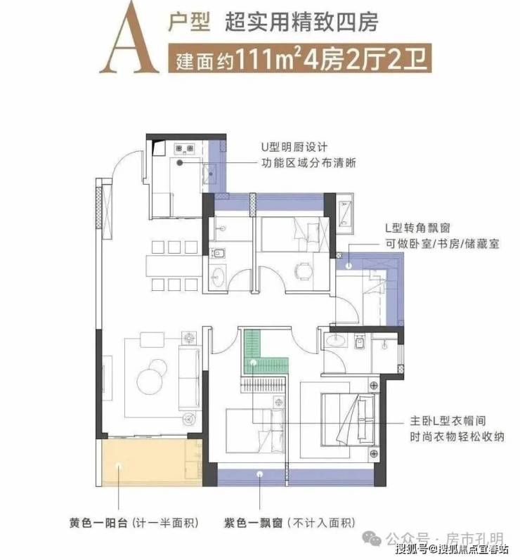 建面111㎡4房2厅2卫A户型:四房设计实用性强,动静分区明确,餐客厅一体,阳台开间宽敞。主卧套房设计,带卫生间和衣帽间,居住舒适度高。