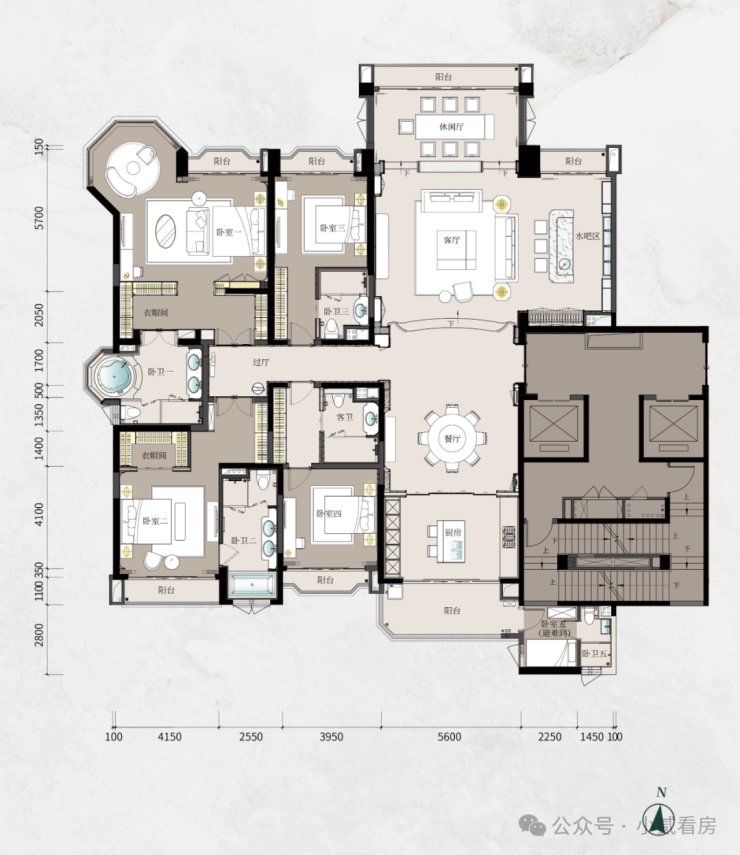 以约 236㎡的 A3 星盈淡雅户型为例,五房三厅五卫的设计,空间布局合理,功能齐全。南北通透的设计,让室内空气流通顺畅,同时奢享江城园景。