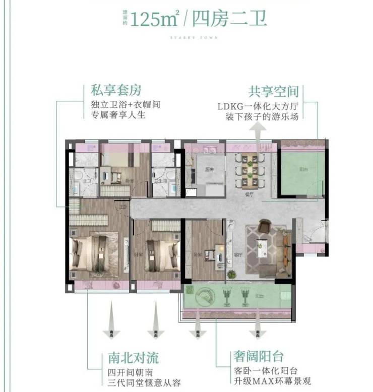 125方4+1房2卫,五开间朝南,客餐厅主卧南北对流,超实用LDKG大方厅,满足生活多样使用