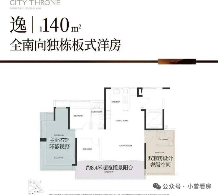 约8.4米南向巨幕阳台,主卧270°飘窗,能最大程度引园景入室。